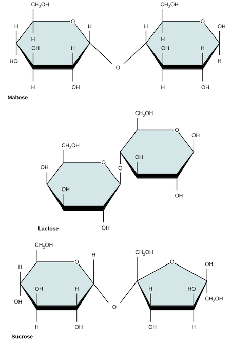 Common disaccharides include lactose, maltose, and sucrose. Lactose is a disaccharide consisting of glucose and galactose and is found naturally in milk. Many people can’t digest lactose as adults, resulting in lactose intolerance (which you or your friends may be all too familiar with). Maltose, or malt sugar, is a disaccharide made up of two glucose molecules. The most common disaccharide is sucrose (table sugar), which is made of glucose and fructose.