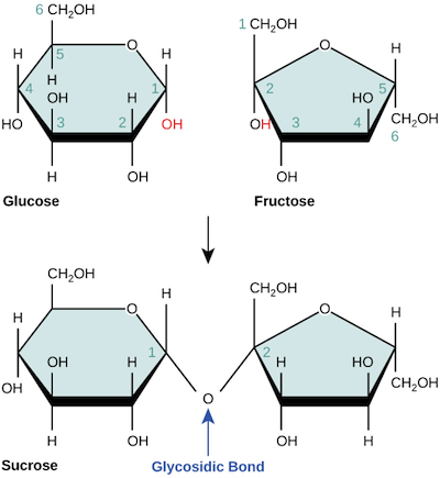 In some cases, it’s important to know which carbons on the two sugar rings are connected by a glycosidic bond. Each carbon atom in a monosaccharide is given a number, starting with the terminal carbon closest to the carbonyl group (when the sugar is in its linear form). This numbering is shown for glucose and fructose, above. In a sucrose molecule, the carbon of glucose is connected to the carbon of fructose, so this bond is called a - glycosidic linkage.