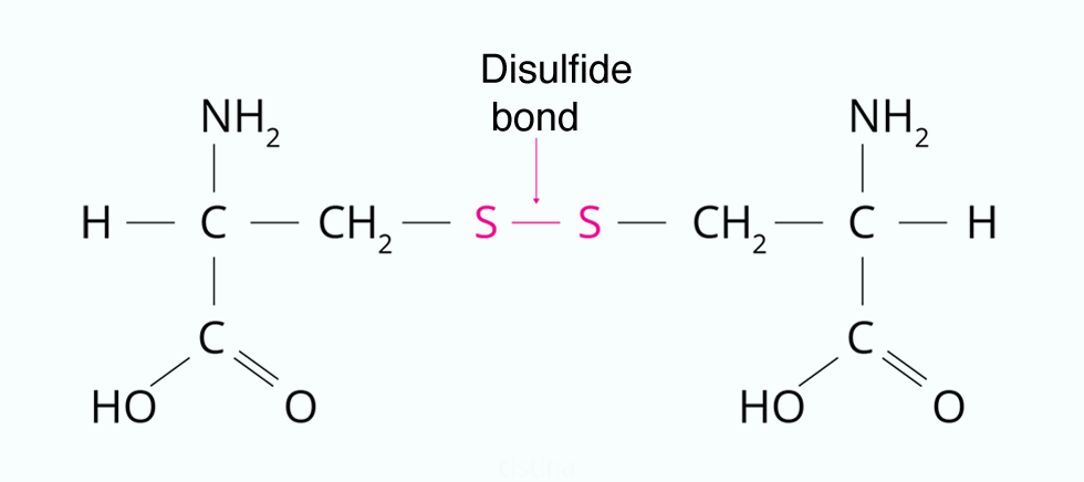 Disulfide bonds are covalent bonds formed between the sulfur atoms of two cysteine residues in a protein tertiary structure. Cysteine is an amino acid containing a thiol group (-SH). When two cysteine residues come close together in a protein’s tertiary or quaternary structure, the sulfur atoms can undergo an oxidation reaction, resulting in the formation of a disulfide bond (-S-S-). hey act like molecular “safety pins,” keeping parts of the polypeptide firmly attached to one another.