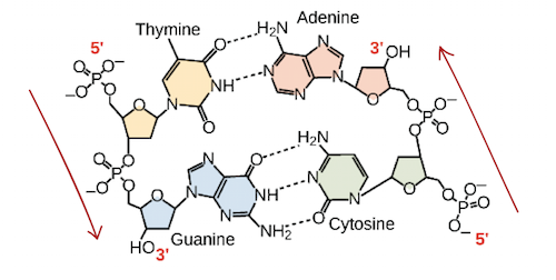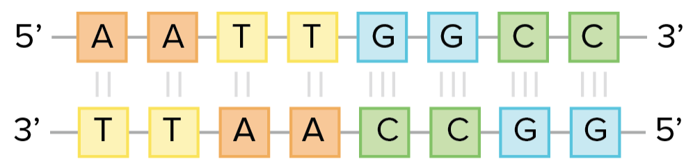 For instance, if you know that the sequence of one strand is 5’-AATTGGCC-3’, the complementary strand must have the sequence 3’-TTAACCGG-5’. This allows each base to match up with its partner: