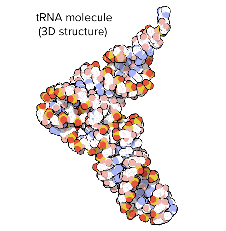Transfer RNAs (tRNAs) are also involved in protein synthesis, but their job is to act as carriers – to bring amino acids to the ribosome, ensuring that the amino acid added to the chain is the one specified by the mRNA. Transfer RNAs consist of a single strand of RNA, but this strand has complementary segments that stick together to make double-stranded regions. This base-pairing creates a complex 3D structure important to the function of the molecule.