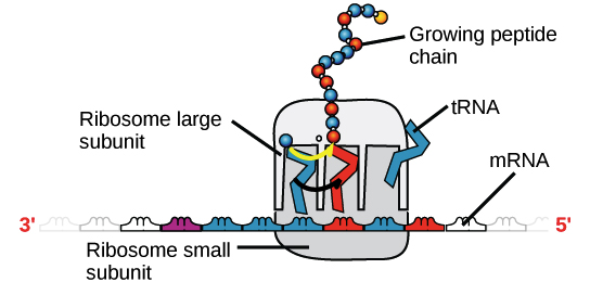 Once an mRNA has been produced, it will associate with a ribosome, a molecular machine that specializes in assembling proteins out of amino acids. The ribosome uses the information in the mRNA to make a protein of a specific sequence, “reading out” the mRNA’s nucleotides in groups of three, or codons, and adding a particular amino acid for each codon.