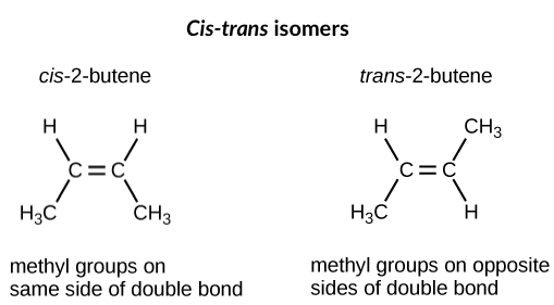 For example, in 2-butene (), the two methyl groups () can occupy different positions relative to the double bond central to the molecule. If the methyl groups are on the same side of the double bond, this is called the cis configuration of 2-butene; if they are on opposite sides, this is the trans configuration.