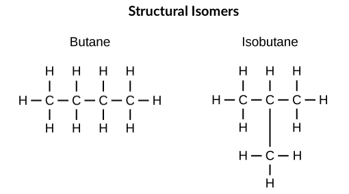 In structural isomers, the atoms in each isomer are connected, or bonded, in different ways. As a result, structural isomers often contain different functional groups or patterns of bonding. Consider butane and isobutane, shown above: both molecules have four carbons and ten hydrogens (), but butane is linear and isobutane is branched. As a result, the two molecules have different chemical properties (such as lower melting and boiling points for isobutane). Because of these differences, butane is typically used as a fuel for cigarette lighters and torches, whereas isobutane is often employed as a refrigerant or as a propellant in spray cans.