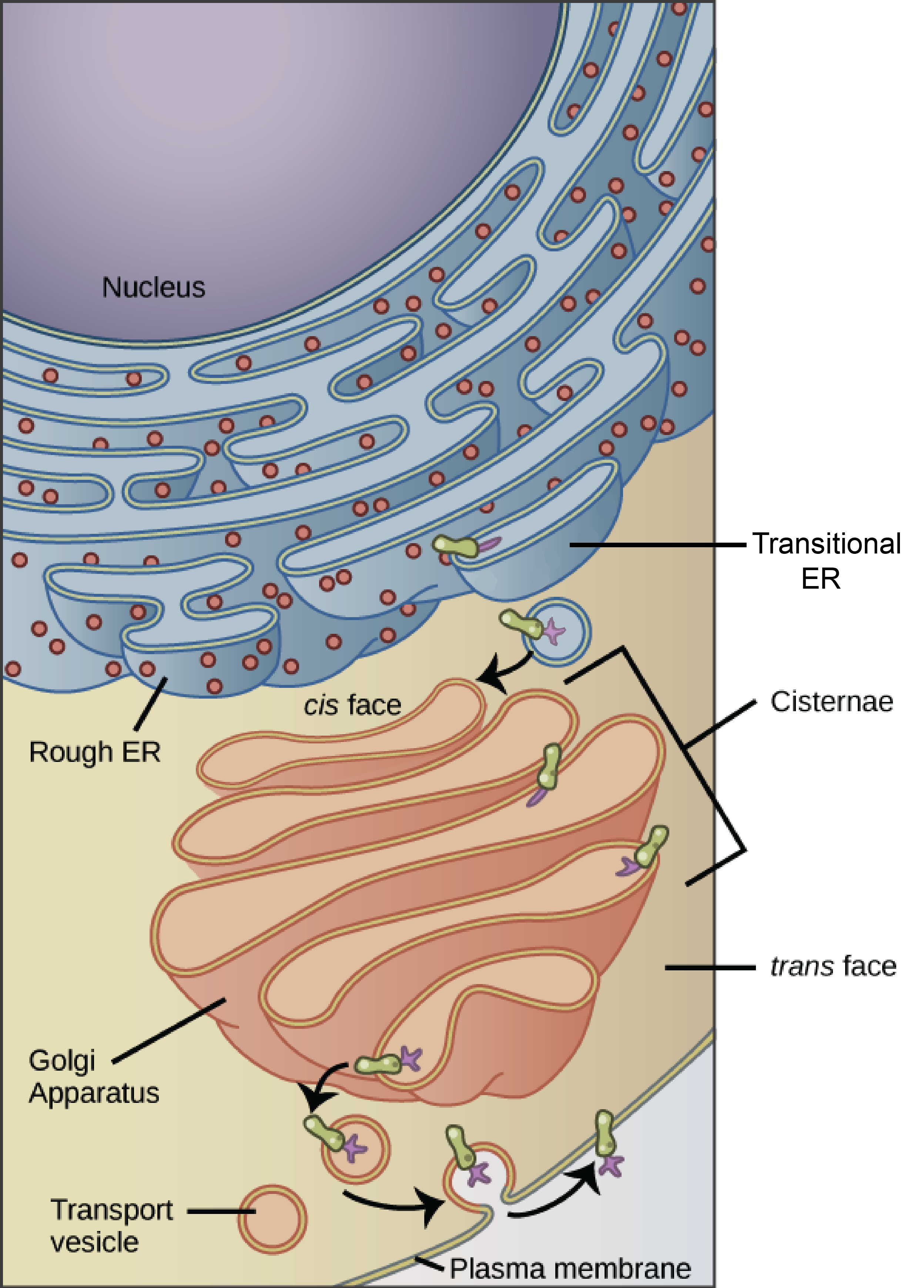 The receiving side of the Golgi apparatus is called the cis face and the opposite side is called the trans face. Transport vesicles from the ER travel to the cis face, fuse with it, and empty their contents into the lumen of the Golgi apparatus.