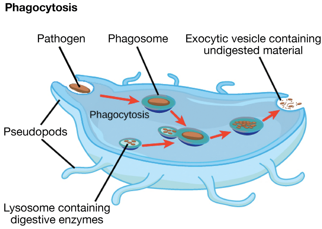 Lysosomes can also digest foreign particles that are brought into the cell from outside. As an example, let’s consider a class of white blood cells called macrophages, which are part of the human immune system. In a process known as phagocytosis, a section of the macrophage’s plasma membrane invaginates—folds inward—to engulf a pathogen, as shown below.