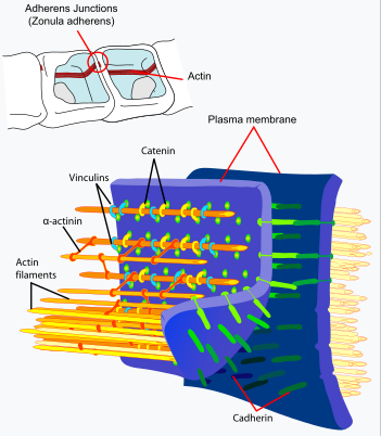 Cadherins are molecules important in forming adherens junctions that let cells adhere to each other. Cadherins are a class of type-1 transmembrane proteins, and they depend on calcium (Ca) ions to function, hence their name.