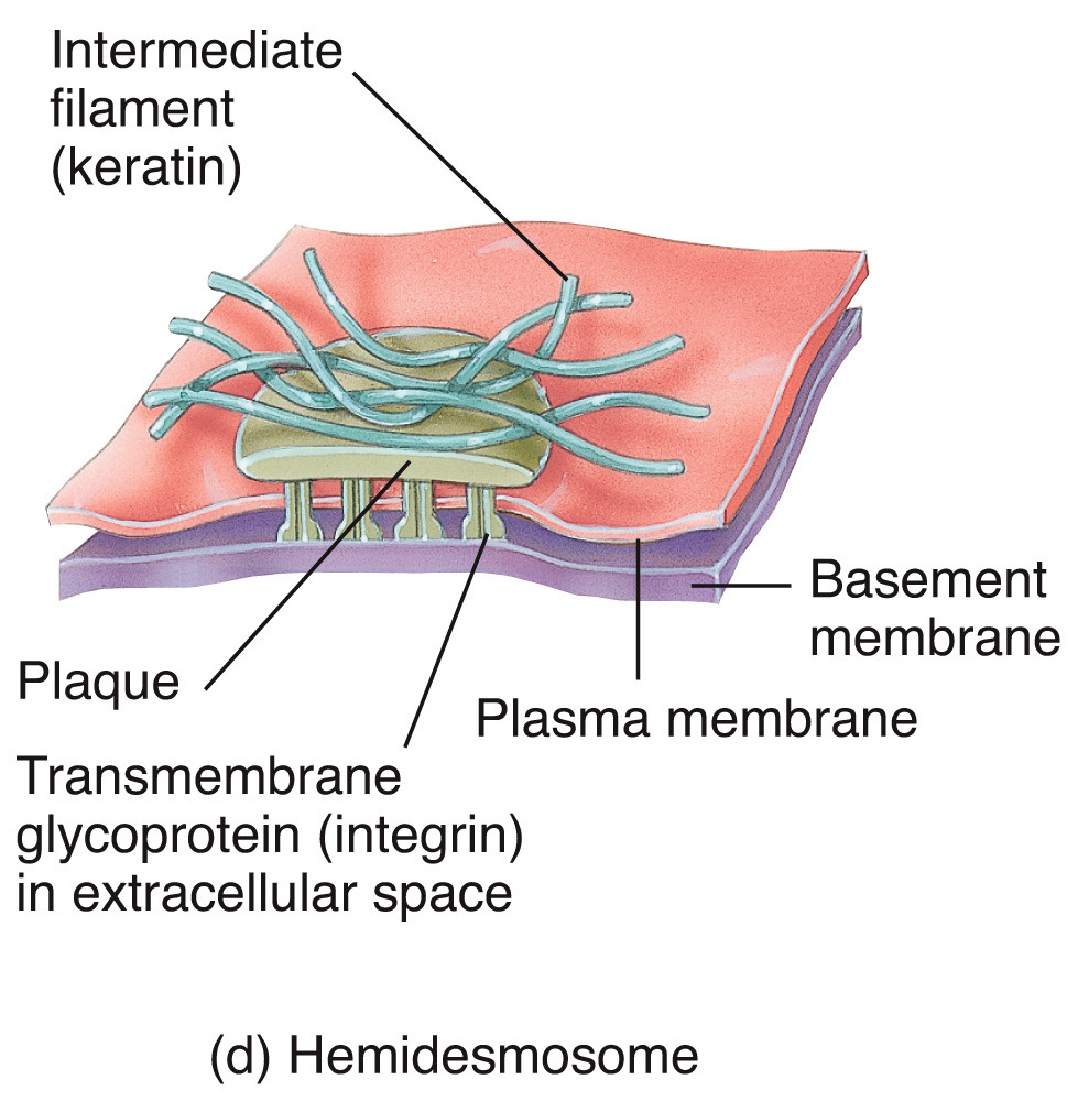 Hemidesmosomes are very small stud-like structures that are similar in form to desmosomes, however, desmosomes attach to adjacent cells. They are a type of cell junction that aid in anchoring the skin and other organs to the underlying basement membrane.