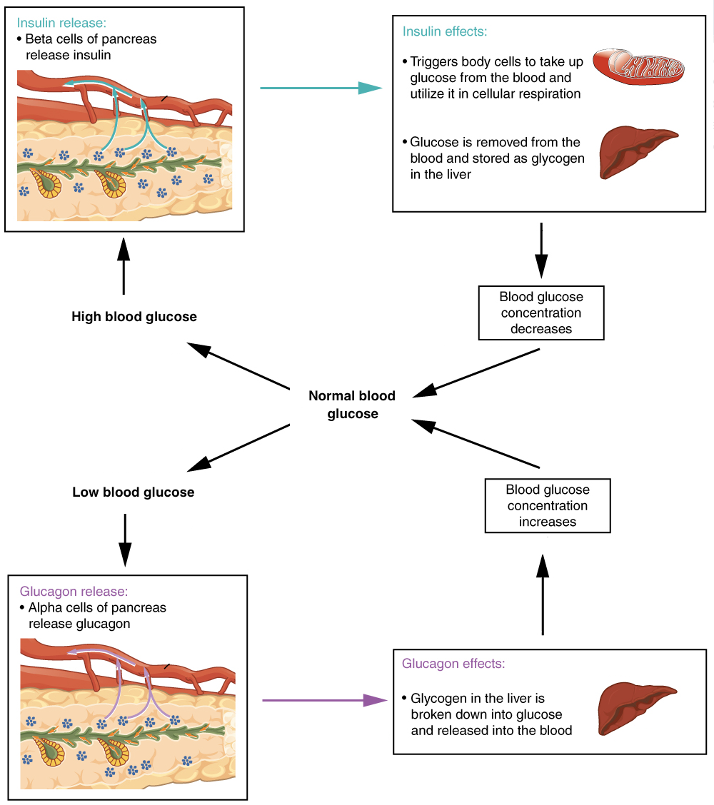 Glucagon does the opposite: it increases the concentration of glucose in the blood. If you haven’t eaten for a while, your blood glucose levels fall, triggering the release of glucagon from another group of pancreatic cells, the α cells. Glucagon acts on the liver, causing glycogen to be broken down into glucose and released into the bloodstream, causing blood sugar levels to go back up. This reduces glucagon secretion and brings the system back to homeostasis.