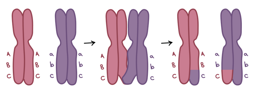 The spots where crossovers happen are more or less random, leading to the formation of unique chromosomes with unique combinations of alleles.