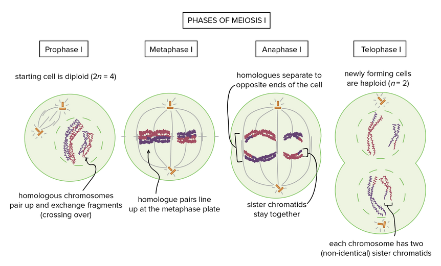 The goals of meiosis uses a two-step division process. Homologue pairs separate during the first round of cell division, called meiosis I. Sister chromatids separate during a second round, called meiosis II.