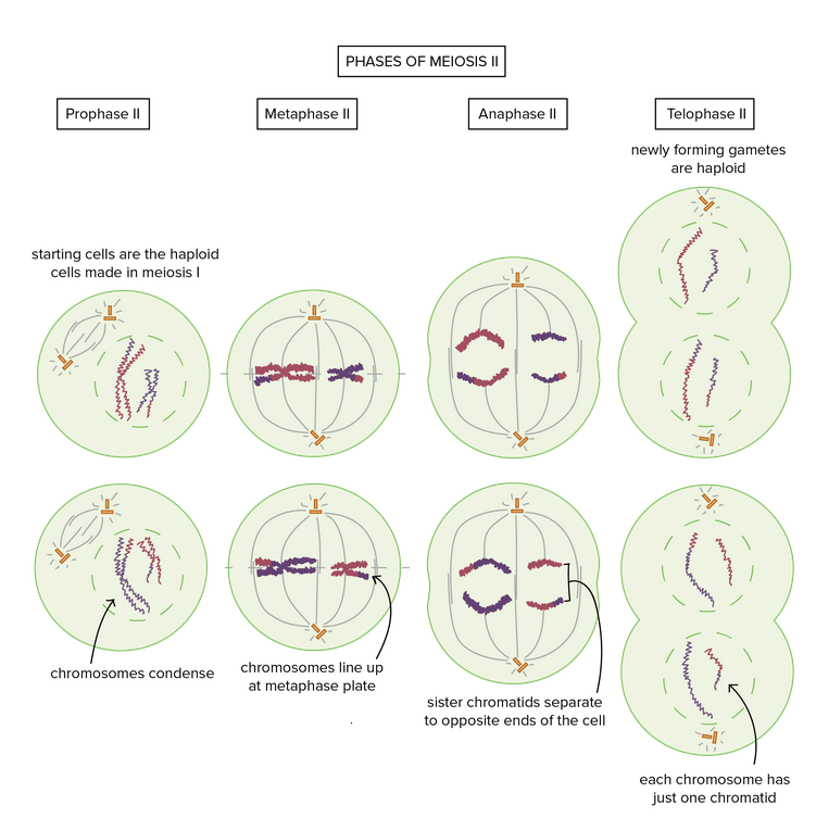 The cells that enter meiosis II are the ones made in meiosis I. These cells are haploid but their chromosomes still consist of two sister chromatids. In meiosis II, the sister chromatids separate, making haploid cells with non-duplicated chromosomes