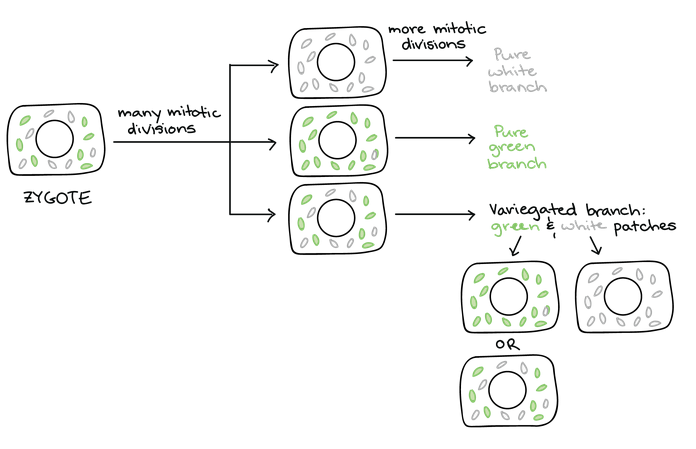 Over the many cell divisions, some cells will have a pure set of normal chloroplasts (green patches) while others get a pure set of nonfunctional chloroplasts) white patches). Others yet will have a mix of normal and nonfunctional chloroplasts (mixed patches).