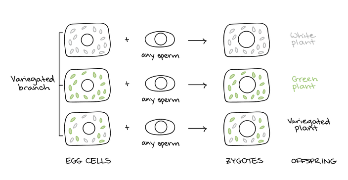 If a branch is variegated, the cell types may give rise to egg cells that lead to green, white, or variegated offspring in unpredictable ratios.