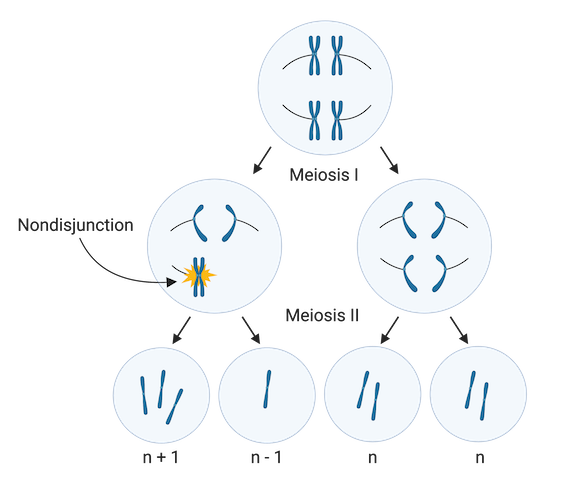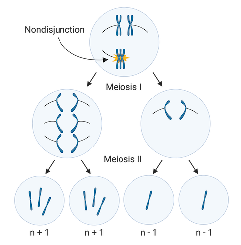 The diagram below shows how nondisjunction can take place during meiosis I if homologous chromosomes don’t separate, and how this can lead to the production of aneuploid gametes.