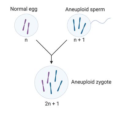 When an aneuploid sperm or egg combines with a normal sperm or egg in fertilization, it makes a zygote which is also aneuploid. For instance, if a sperm cell with one extra chromosome (n + 1) combines with a normal egg cell (n), the resulting zygote, or one-celled embryo, will have a chromosome number of 2n + 1.