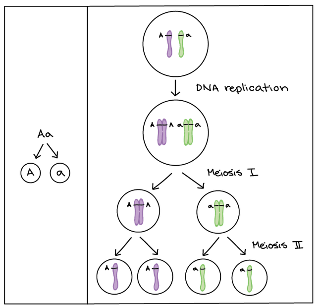 The members of a homologous pair separate in meiosis, so each sperm or egg receives just one member. This process mirrors segregation of alleles into gametes in Mende’s Law of Segregation.