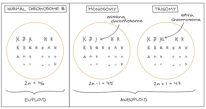 An aneuploid is missing one or more chromosomes, unlike a euploid. For instance, human somatic cells with chromosome numbers of (2n - 1) = 45 or (2n + 1) = 47 are aneuploid. Similarly, a normal human egg or sperm has just one set of chromosomes (n = 23). An egg or sperm with (n - 1) = 22 or (n + 1) = 24 chromosomes is considered to be aneuploid.