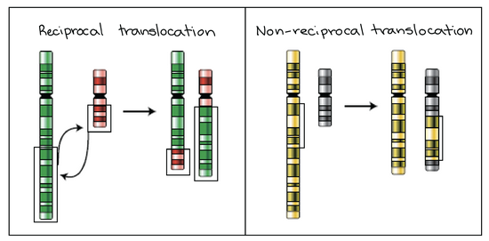 - A translocation, where a piece of one chromosome gets attached to another chromosome. A reciprocal translocation involves two chromosomes swapping segments; a non-reciprocal translocation means that a chunk of one chromosome moves to another.