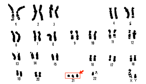 Here is a karyotype, or image of the chromosomes, from a person with Down Syndrome, showing the characteristic three copies of chromosome 21: