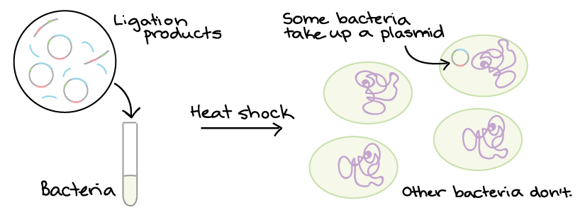 Not all colonies will necessarily contain the right plasmid. That’s because during ligation, DNA fragments don’t always get “pasted” in exactly the way we intend. Instead, we must contain DNA from several colonies and see whether each one contain the right plasmid. Methods like restriction enzyme digestion and PCR are commonly used to check the plasmids.