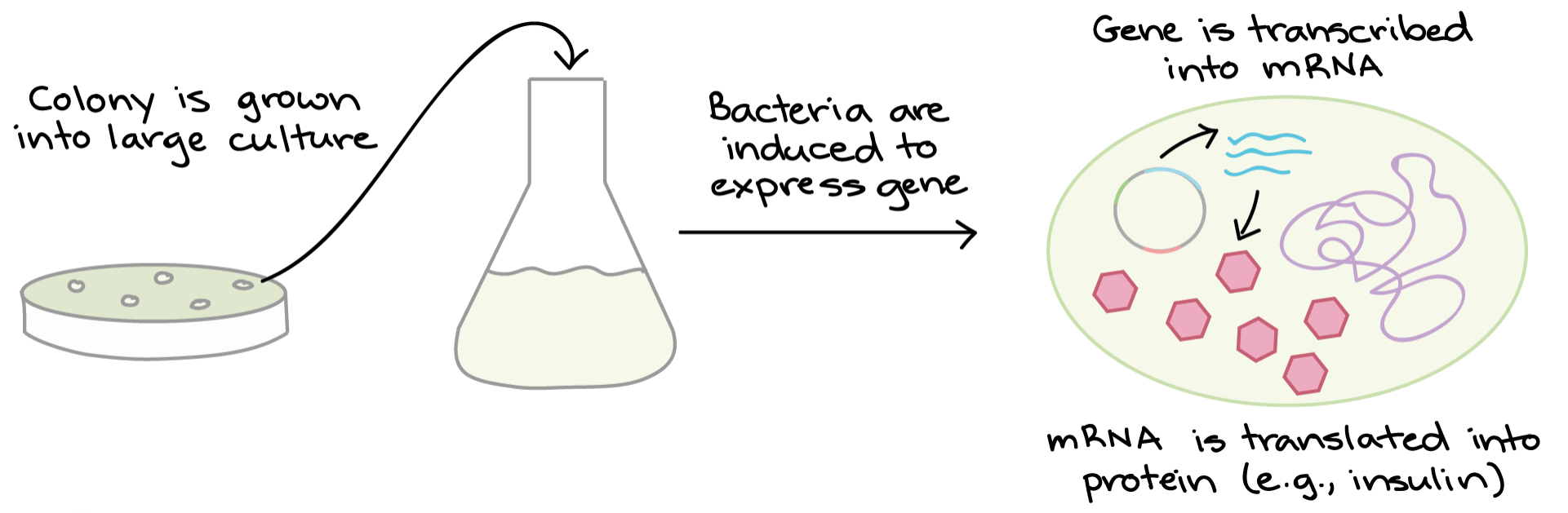 The bacteria serves as miniature “factories,” churning out large amounts of proteins. For instance, if our plasmid contained the human insulin gene, the bacteria would start transcribing the gene and translating the mRNA to produce man molecules of human insulin protein.