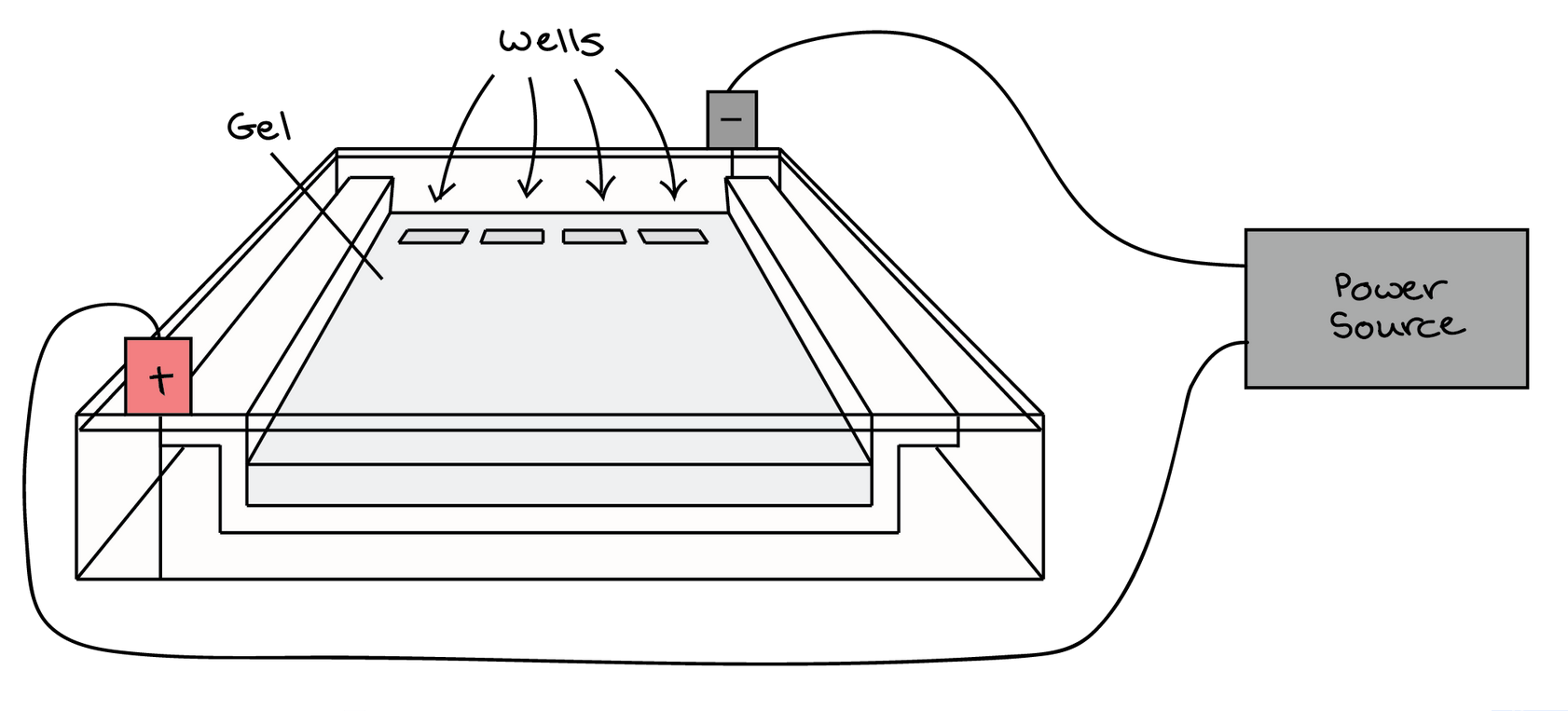 Before the DNA samples are added, the gel must be placed in a gel box. One end of the box is hooked to a positive electrode, while the other end is hooked to a negative electrode. The main body of the box, where the gel is placed, is filled with a salt-containing buffer solution that can conduct current. Although you may not be able to see in the image above, the buffer fills the gel box to a level where it barely covers the gel.