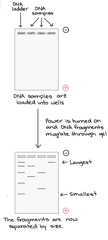 Once the fragments have be separated, we can examine the gel and see what sizes of bands are found on it. When a gel is stained with a DNA-binding dye and placed under UV lights, the DNA fragments will glow, allowing us to see the DNA present at different locations along the length of the gel.