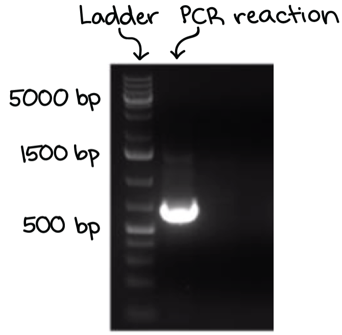 By comparing the bands in a sample to the DNA ladder, we can determine their approximate sizes. For instance, the bright band on the gel above is roughly 700 base pairs (bp) in size.