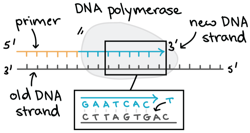 Once the RNA primer is in place, DNA polymerase “extends” it, adding nucleotides one by one to make a new DNA strand that’s complementary to the template strand.