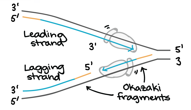 The other new strand, which runs 5’ to 3’ away from the fork, is trickier. This strand is made in fragments because, as the fork moves forward, the DNA polymerase (which is moving away from the fork) must come off and reattach on the newly exposed DNA. This tricky strand, which is made in Okazaki fragments, is called the lagging strand.