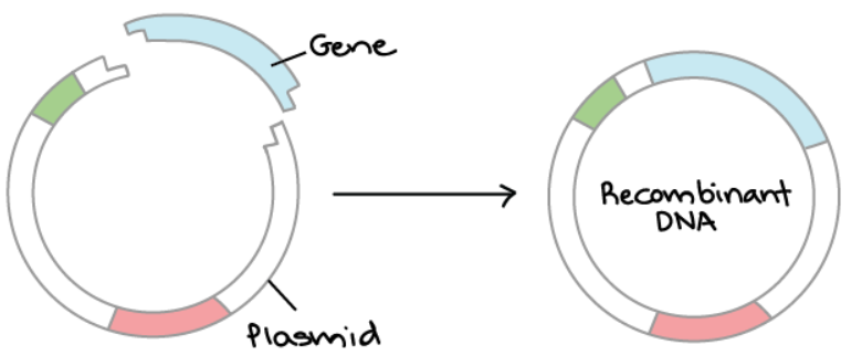 - Cut open the plasmid and “paste” in the gene. This process relies on restriction enzymes (which cut DNA) and DNA ligase (which joins DNA).