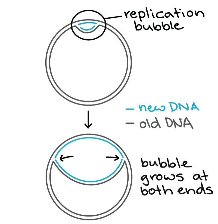 As the DNA opens, two replication forks are formed, together making up what’s called a replication bubble. The replication forks will move in opposite directions as replication proceeds.