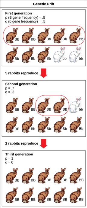 In the example, the allele frequencies of the five lucky rabbits are perfectly represented in the second generation, as shown at right. Because the 5-rabbit “sample” in the previous generation had different allele frequencies than the population as a whole, frequencies of B and b in the population have shifted to 0.7 and 0.3, respectively.