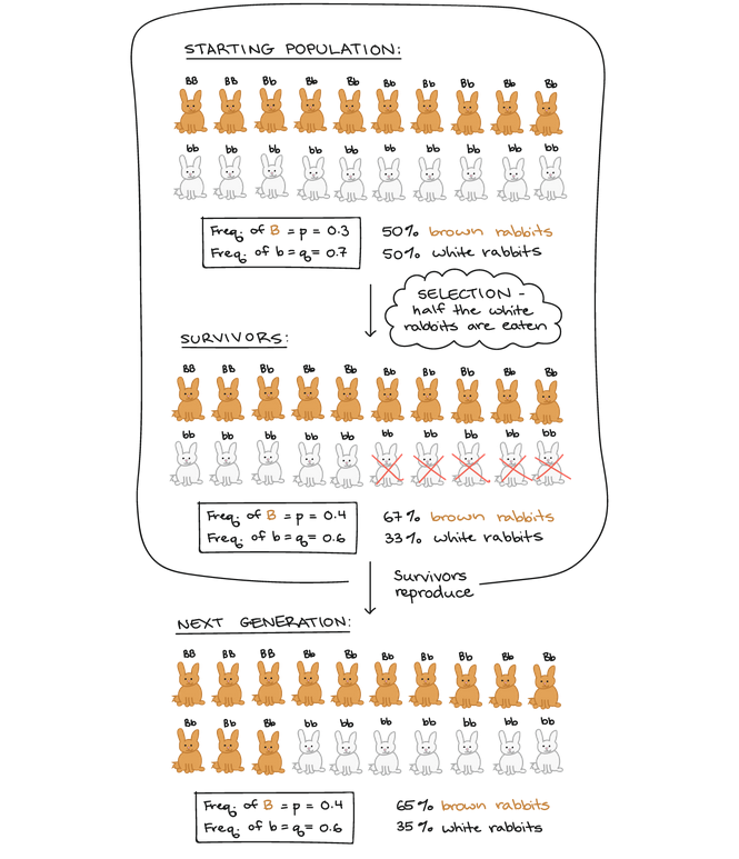 As an example, let’s imagine a population of brown and white rabbits, whose coat color is determined by dominant brown (B) and recessive white (b) alleles of a single gene. If a predator such as a hawk can see white rabbits (genotype bb) more easily than brown rabbits (BB and Bb) against the backdrop of a grassy field, brown rabbits are more likely than white rabbits to survive hawk predation. Because more brown than white rabbits will survive to reproduce, the next generation will probably contain a higher frequency of B alleles.