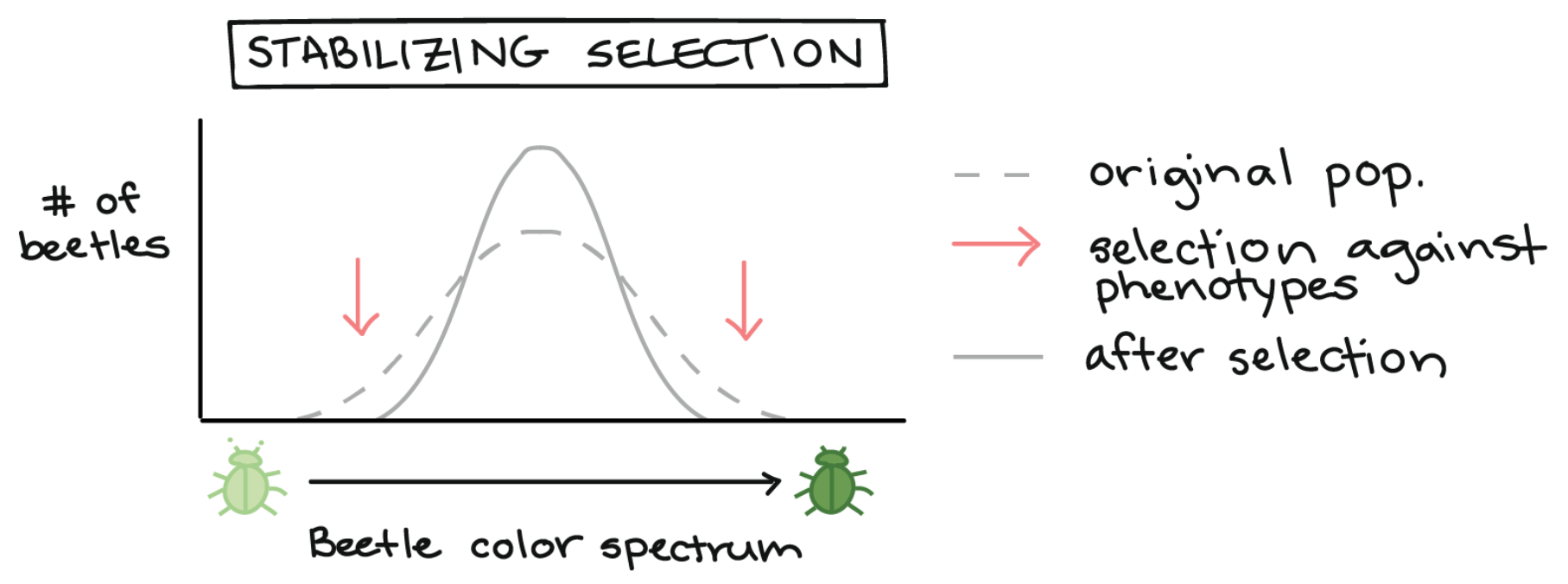 There are three basic ways that natural selection can influence distribution of phenotypes for polygenic traits in a population. To illustrate these forms of selection, let’s use an imaginary beetle population, in which beetle color is controlled by many genes and varies in a spectrum from light to dark green.