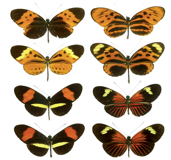 Müllerian mimicry is a natural phenomenon in which two or more well-defended species, often foul-tasting and sharing common predators, have come to mimic each other’s honest warning signals, to their mutual benefit. In Müllerian mimicry, multiple species share the same warning coloration, but all of them actually do have defenses. For example, the figure below shows pairs of foul-tasting butterflies that share similar coloration. Once a predator encounters either member of the pair and discovers its unpleasant taste, it is likely to avoid both species in the future. This similar appearance could have been evolutionarily favored because when members of the two species looked more similar, both would have tended to get eaten at lower rates—thanks to the protection provided by a predator learning to avoid either.