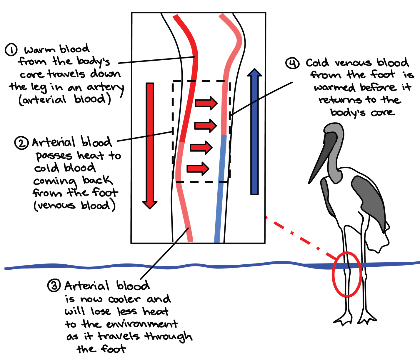 A countercurrent heat exchange describes allowing heat to be transferred from blood vessels containing warmer blood to those containing cooler blood. For example, in the leg of a wading bird, the artery that runs down the leg carries warm blood from the body. The artery is positioned right alongside a vein that carries cold blood up from the foot. The descending, warm blood passes much of its heat to the ascending, cold blood by conduction. This means that less heat will be lost in the foot due to the reduced temperature difference between the cooled blood and the surroundings and that the blood moving back into the body’s core will be relatively warm, keeping the core from getting cold.