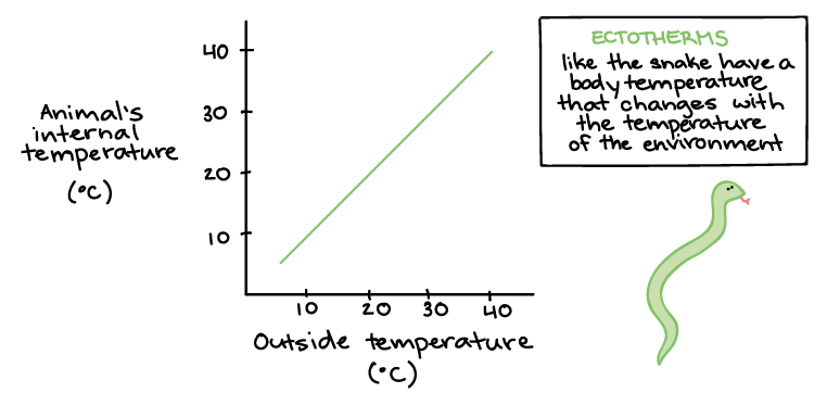 In ectotherms, body temperature mainly depends on external heat sources, unlike endotherms. That is, ectotherm body temperature rises and falls along with the temperature of the surrounding environment. Although ectotherms do generate some metabolic heat—like all living things—ectotherms can’t increase this heat production to maintain a specific internal temperature.