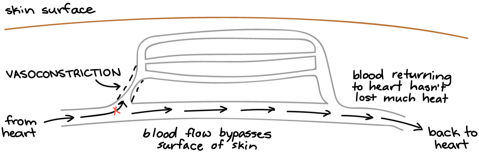 Vasoconstriction is the narrowing of the blood vessels resulting from contraction of the muscular wall of the vessels, in particular the large arteries and small arterioles. In endotherms, warm blood from the body’s core typically loses heat to the environment as it passes near the skin. Shrinking the diameter of blood vessels that supply the skin reduces blood flow and helps retain heat. The process is the opposite of vasodilation, the widening of blood vessels.