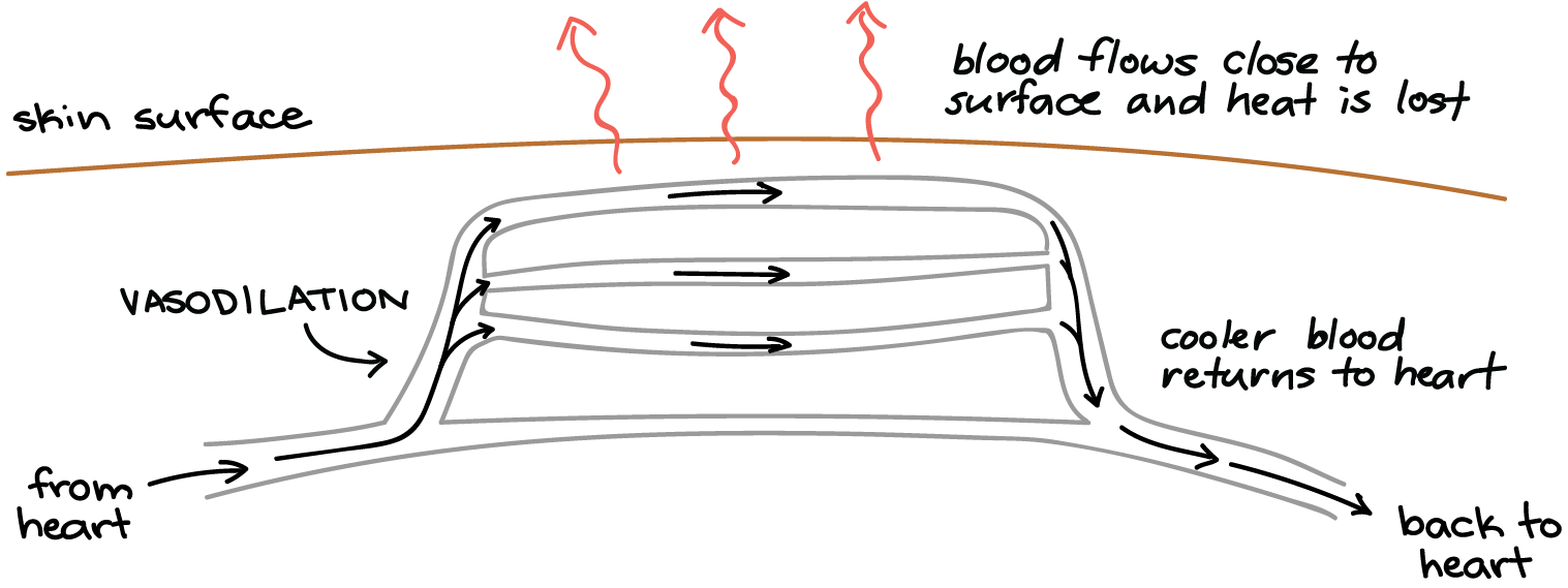 Vasodilation, also known as vasorelaxation, is the widening of blood vessels. It results from relaxation of smooth muscle cells within the vessel walls, in particular in the large veins, large arteries, and smaller arterioles. Vasodilation increases blood flow to the skin and helps the animal lose some of its extra heat to the environment. Vasodilation is the opposite of vasoconstriction, which is the narrowing of blood vessels.
