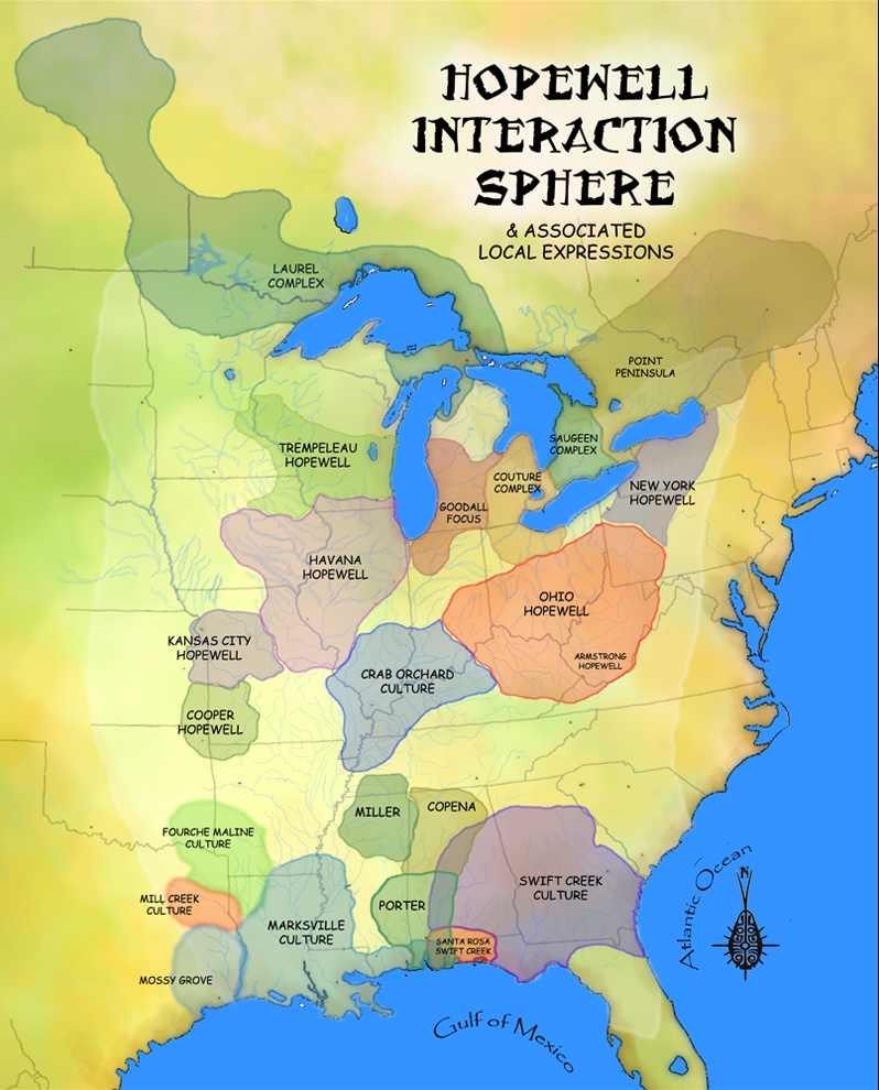 The Hopewell tradition, also called the Hopewell culture and Hopewellian exchange, describes a network of precontact Native American cultures that flourished in settlements along rivers in the northeastern and midwestern Eastern Woodlands from 100 BCE to 500 CE, in the Middle Woodland period. The Hopewell tradition was not a single culture or society but a widely dispersed set of populations connected by a common network of trade routes.